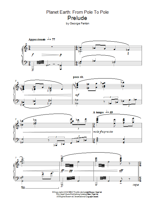 Download or print George Fenton Planet Earth: Prelude sheet music, chords and digital score arranged for Piano Solo. This Film/TV score includes 3 page(s).