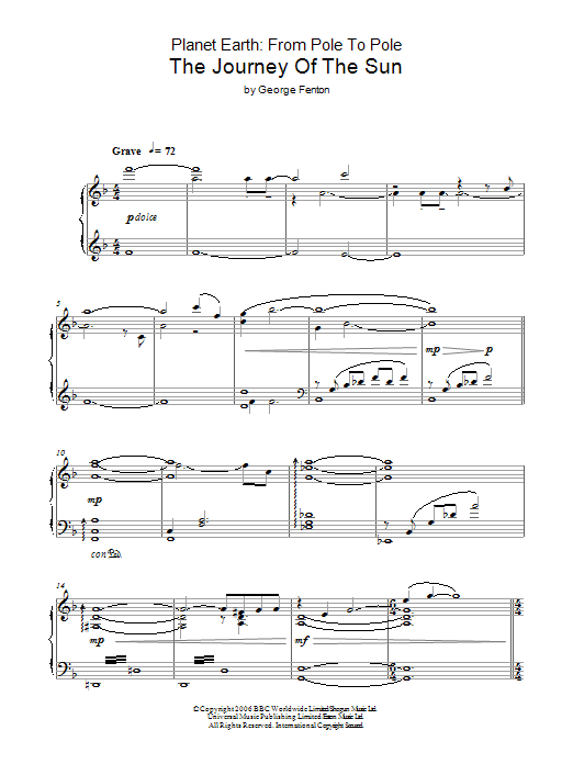 Download or print George Fenton Planet Earth: The Journey Of The Sun sheet music, chords and digital score arranged for Piano Solo. This Film/TV score includes 3 page(s).