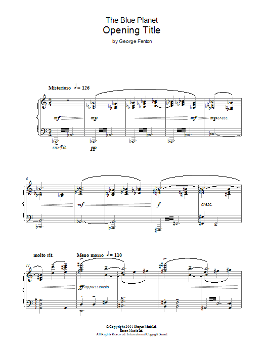Download or print George Fenton The Blue Planet, Opening Title sheet music, chords and digital score arranged for Piano Solo. This Film/TV score includes 2 page(s).