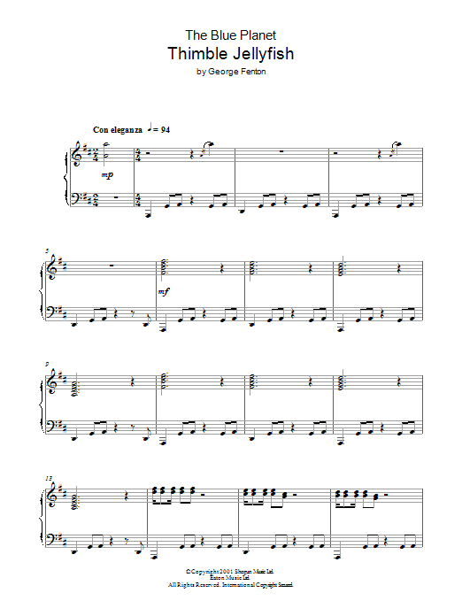 Download or print George Fenton The Blue Planet, Thimble Jelly Fish sheet music, chords and digital score arranged for Piano Solo. This Film/TV score includes 3 page(s).