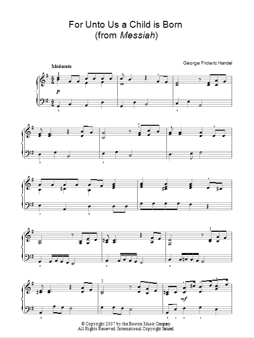 Download or print George Frideric Handel For Unto Us A Child Is Born (from Messiah) sheet music, chords and digital score arranged for Easy Piano. This Classical score includes 3 page(s).