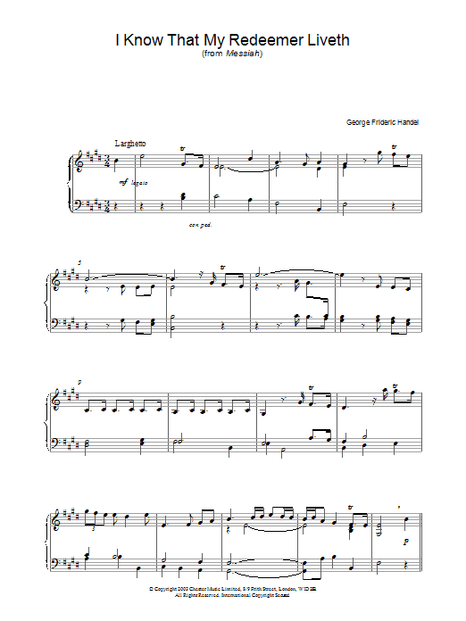 Download or print George Frideric Handel I Know That My Redeemer Liveth sheet music, chords and digital score arranged for Piano Solo. This Classical score includes 3 page(s).