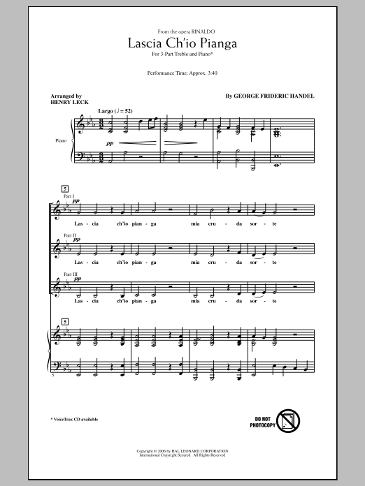Download or print George Frideric Handel Lascia Ch'io Pianga sheet music, chords and digital score arranged for Piano & Vocal. This Classical score includes 3 page(s).