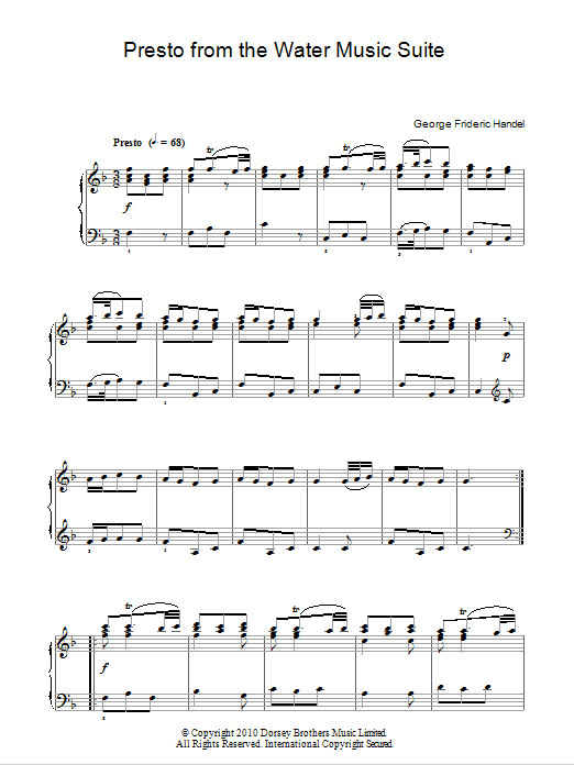 Download or print George Frideric Handel Presto (from The Water Music Suite) sheet music, chords and digital score arranged for Piano Solo. This Classical score includes 3 page(s).