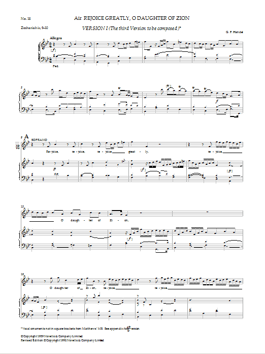 Download or print George Frideric Handel Rejoice Greatly, O Daughter Of Zion (Version I) sheet music, chords and digital score arranged for SATB Choir. This Classical score includes 6 page(s).