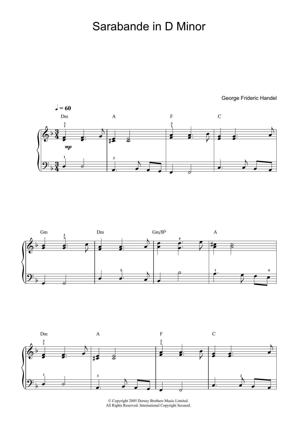 Download or print George Frideric Handel Sarabande (from Harpsichord Suite In D Minor) sheet music, chords and digital score arranged for Piano Solo. This Classical score includes 2 page(s).