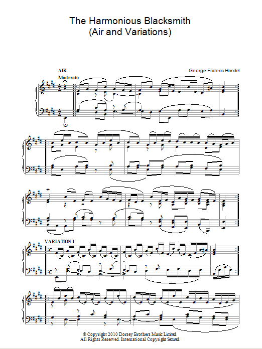 Download or print George Frideric Handel The Harmonious Blacksmith (Air And Variations) sheet music, chords and digital score arranged for Piano Solo. This Classical score includes 4 page(s).