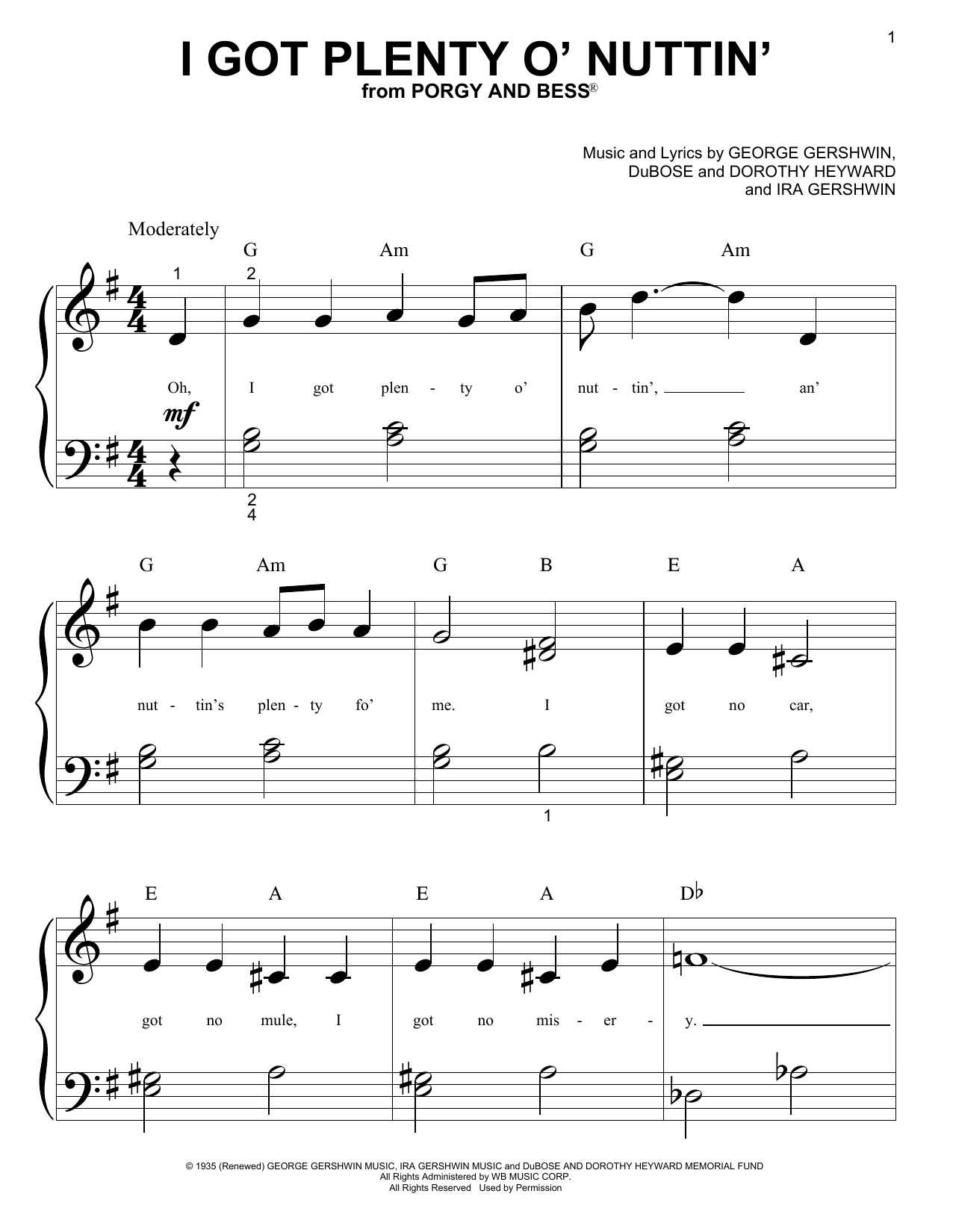 Download or print George Gershwin I Got Plenty O' Nuttin' sheet music, chords and digital score arranged for Very Easy Piano. This Jazz score includes 4 page(s).