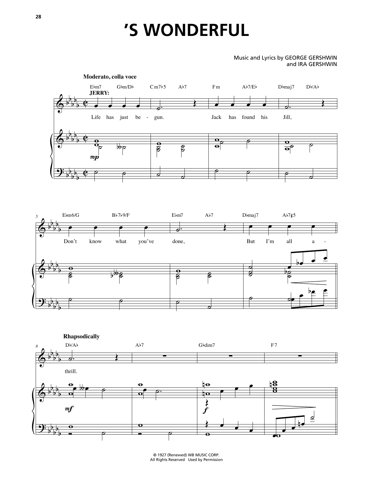 Download or print George Gershwin & Ira Gershwin 'S Wonderful (from An American In Paris) sheet music, chords and digital score arranged for Piano & Vocal. This Jazz score includes 9 page(s).