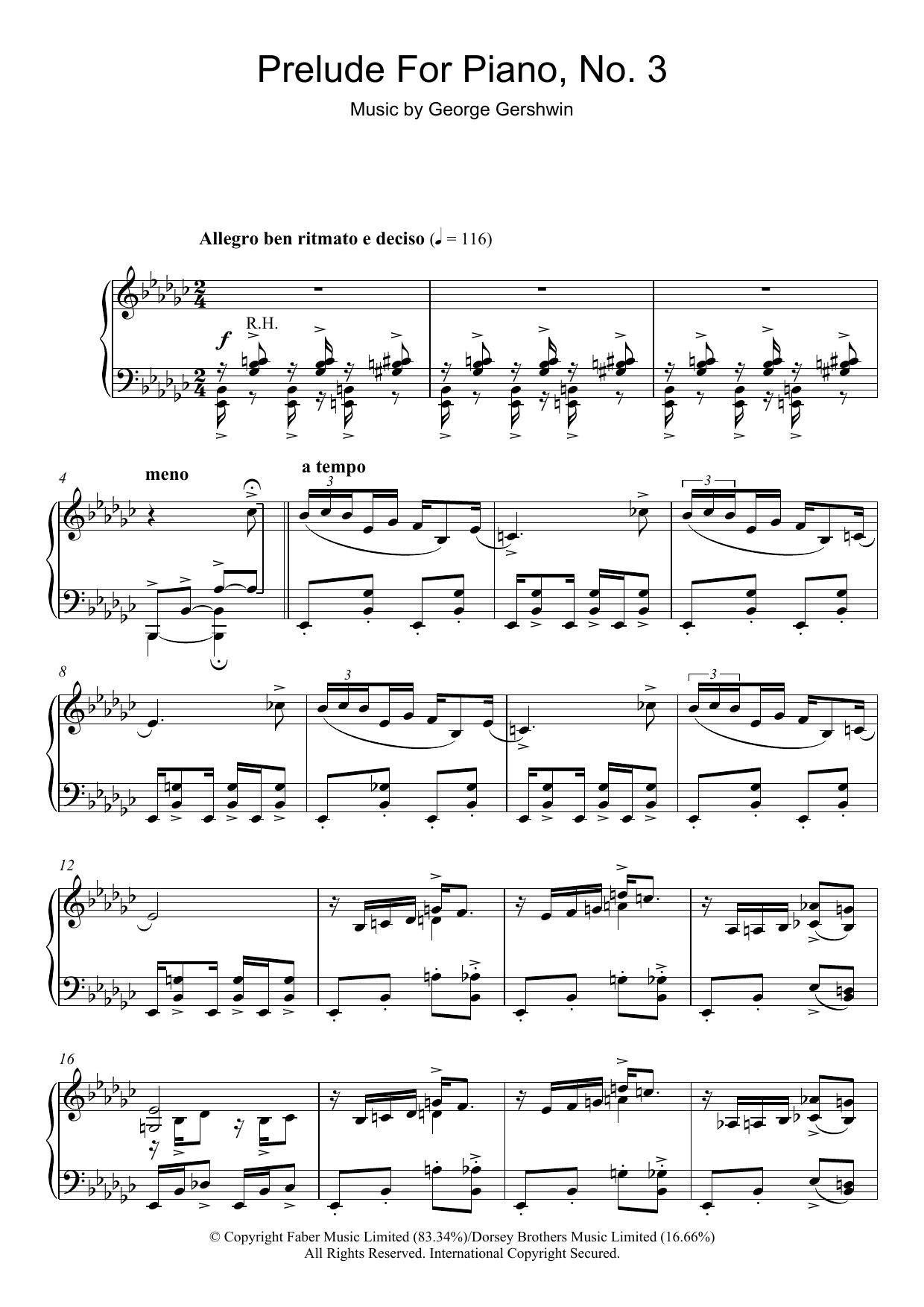 Download or print George Gershwin Prelude For Piano, No.3 sheet music, chords and digital score arranged for Piano Solo. This Jazz score includes 3 page(s).