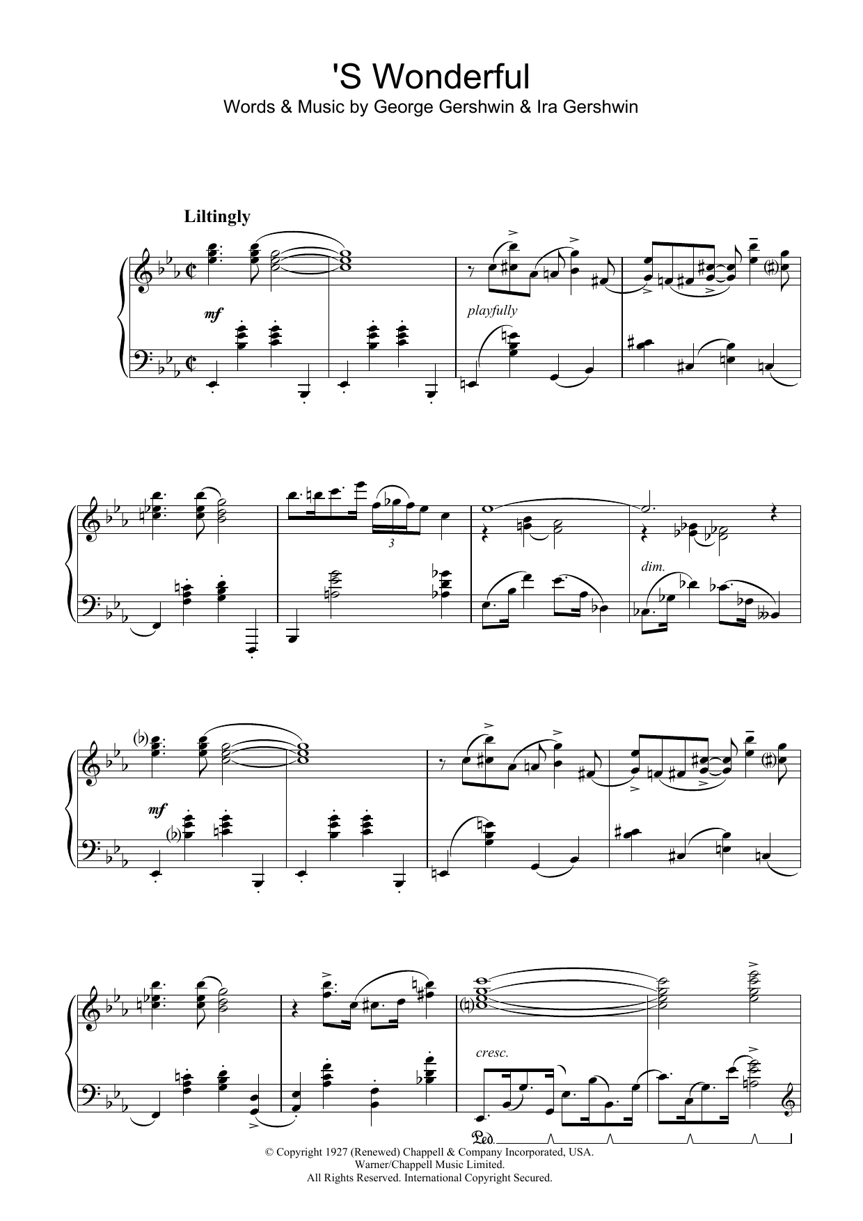 Download or print George Gershwin 'S Wonderful sheet music, chords and digital score arranged for Piano Solo. This Jazz score includes 2 page(s).
