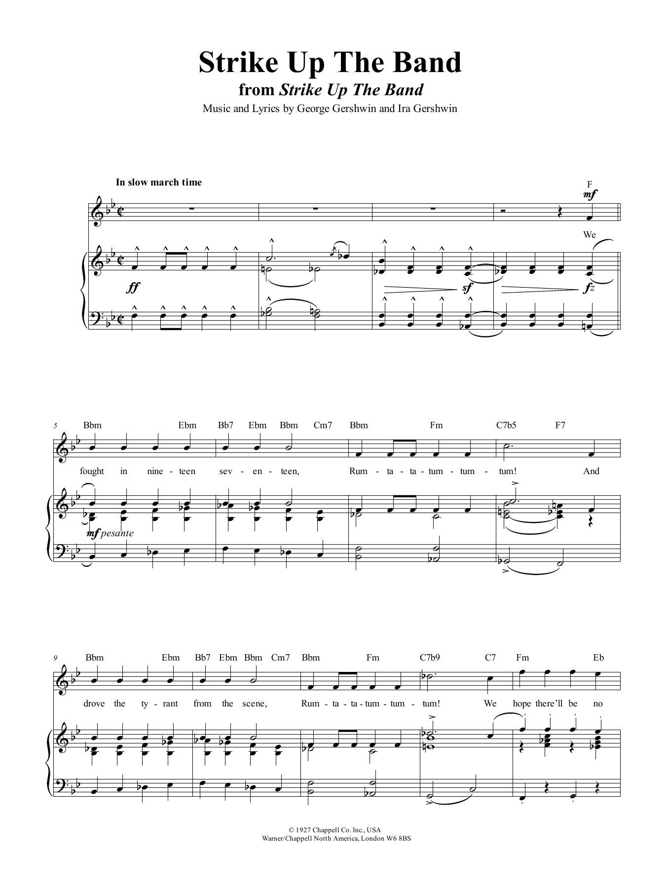 Download or print George Gershwin Strike Up The Band sheet music, chords and digital score arranged for Big Note Piano. This Jazz score includes 3 page(s).