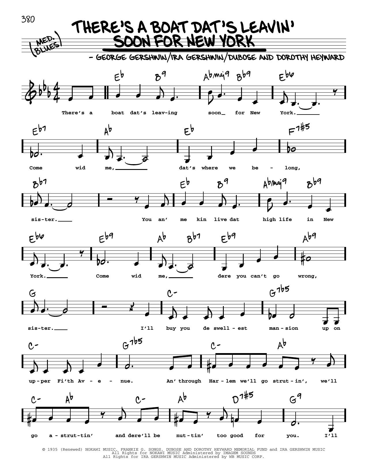 Download or print George Gershwin There's A Boat Dat's Leavin' Soon For New York (Low Voice) sheet music, chords and digital score arranged for Real Book – Melody, Lyrics & Chords. This Jazz score includes 2 page(s).