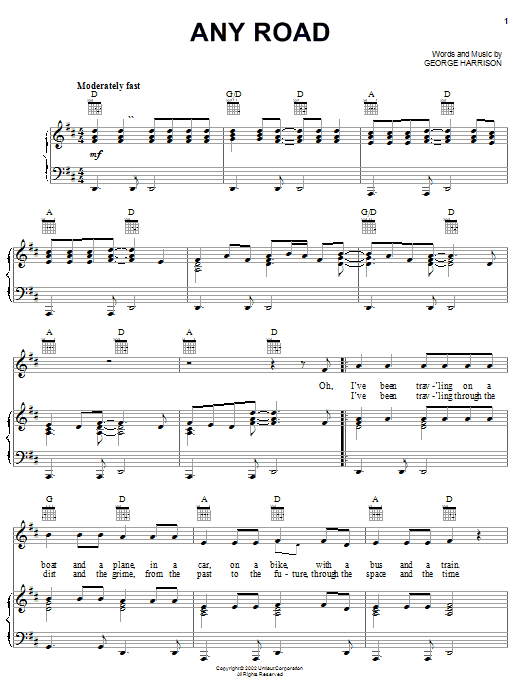 Download or print George Harrison Any Road sheet music, chords and digital score arranged for Piano, Vocal & Guitar Chords (Right-Hand Melody). This Rock score includes 9 page(s).