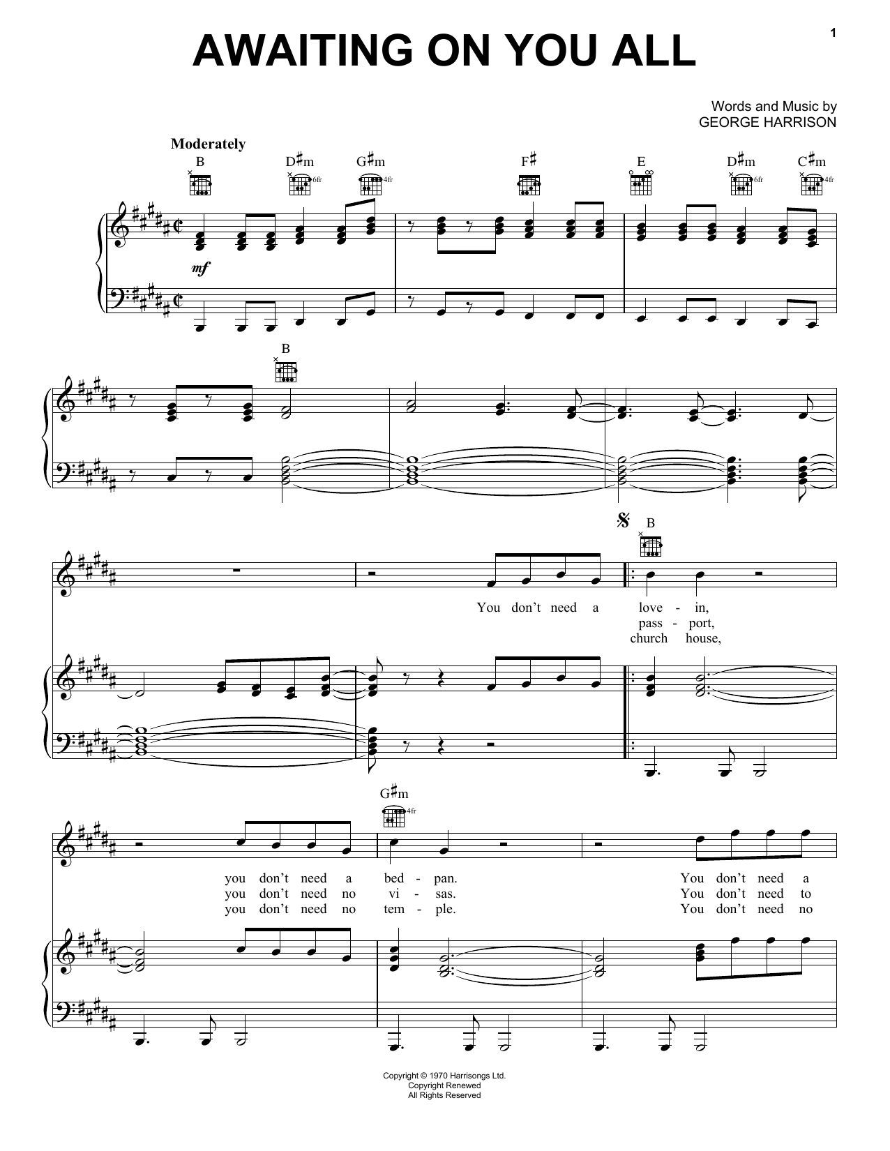 Download or print George Harrison Awaiting On You All sheet music, chords and digital score arranged for Piano, Vocal & Guitar Chords (Right-Hand Melody). This Pop score includes 6 page(s).