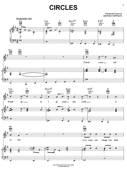 Download or print George Harrison Circles sheet music, chords and digital score arranged for Piano, Vocal & Guitar Chords (Right-Hand Melody). This Pop score includes 6 page(s).