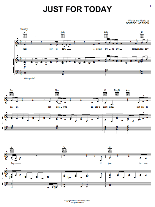 Download or print George Harrison Just For Today sheet music, chords and digital score arranged for Piano, Vocal & Guitar Chords (Right-Hand Melody). This Pop score includes 3 page(s).