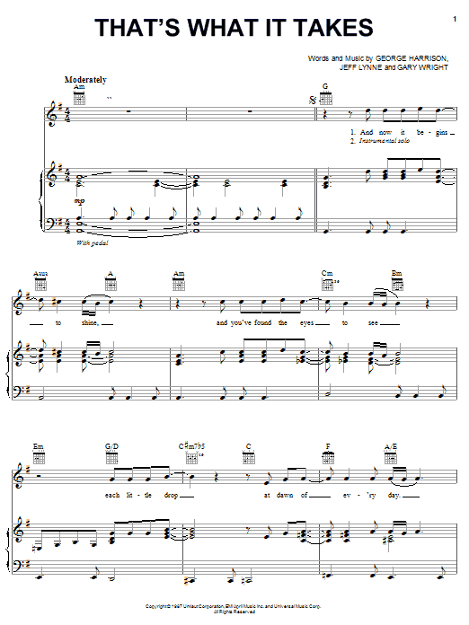 Download or print George Harrison That's What It Takes sheet music, chords and digital score arranged for Piano, Vocal & Guitar Chords (Right-Hand Melody). This Pop score includes 4 page(s).