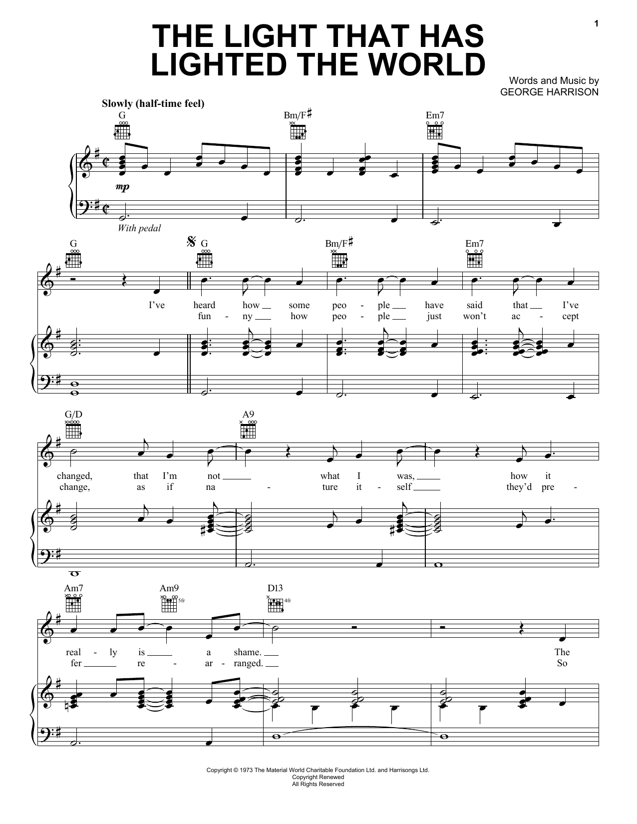 Download or print George Harrison The Light That Has Lighted The World sheet music, chords and digital score arranged for Piano, Vocal & Guitar Chords (Right-Hand Melody). This Pop score includes 5 page(s).