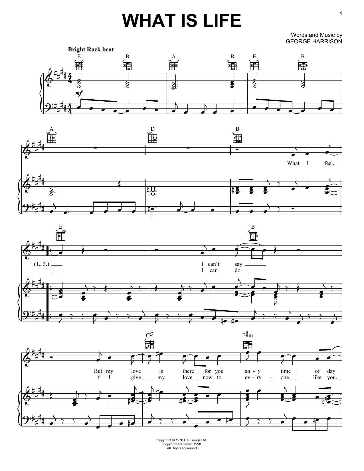 Download or print George Harrison What Is Life sheet music, chords and digital score arranged for Piano, Vocal & Guitar Chords (Right-Hand Melody). This Pop score includes 3 page(s).
