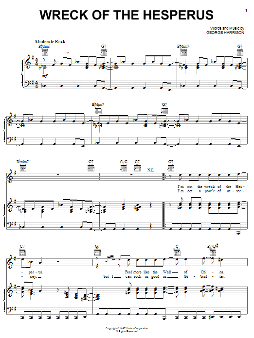 Download or print George Harrison Wreck Of The Hesperus sheet music, chords and digital score arranged for Piano, Vocal & Guitar Chords (Right-Hand Melody). This Pop score includes 6 page(s).