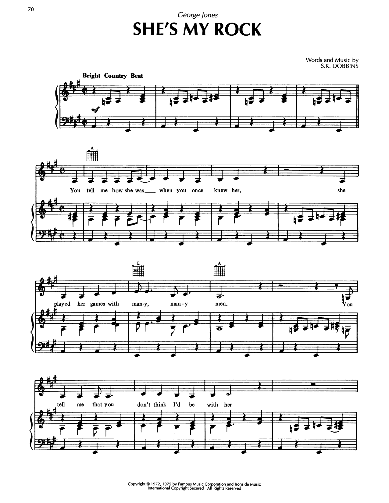 Download or print George Jones She's My Rock sheet music, chords and digital score arranged for Piano, Vocal & Guitar Chords (Right-Hand Melody). This Country score includes 5 page(s).