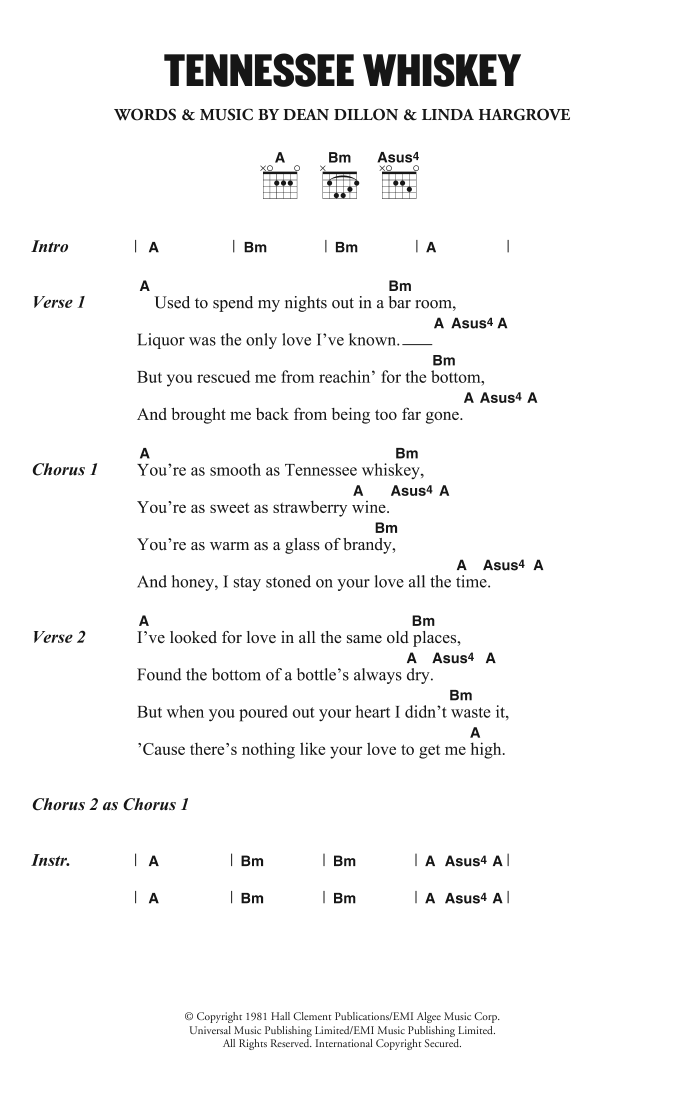 Download or print Chris Stapleton Tennessee Whiskey sheet music, chords and digital score arranged for Guitar Lead Sheet. This Country score includes 2 page(s).