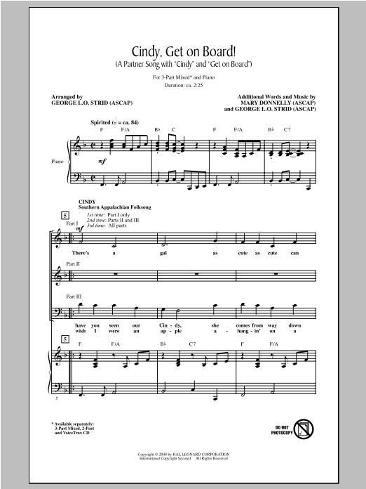 Download or print George L.O. Strid Cindy, Get On Board! sheet music, chords and digital score arranged for 3-Part Mixed Choir. This Children score includes 11 page(s).