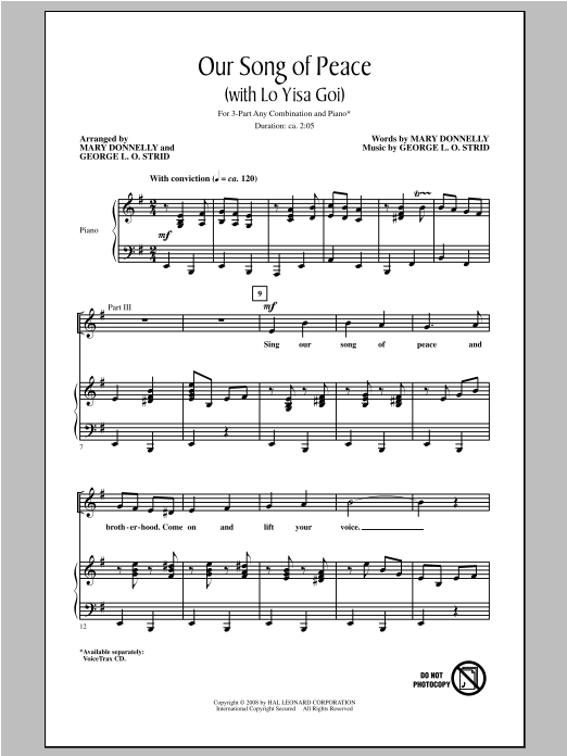 Download or print Mary Donnelly Our Song of Peace (with Lo Yisa Goi) sheet music, chords and digital score arranged for 3-Part Mixed Choir. This Concert score includes 11 page(s).