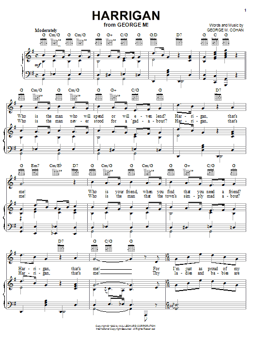 Download or print George M. Cohan Harrigan sheet music, chords and digital score arranged for Easy Piano. This Irish score includes 2 page(s).