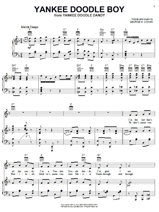 Download or print George M. Cohan Yankee Doodle Boy sheet music, chords and digital score arranged for Piano, Vocal & Guitar Chords (Right-Hand Melody). This Children score includes 5 page(s).