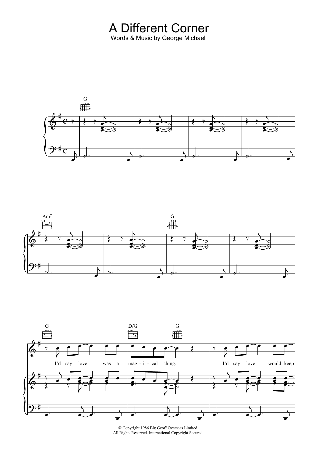 Download or print George Michael A Different Corner sheet music, chords and digital score arranged for Piano, Vocal & Guitar Chords. This Pop score includes 6 page(s).