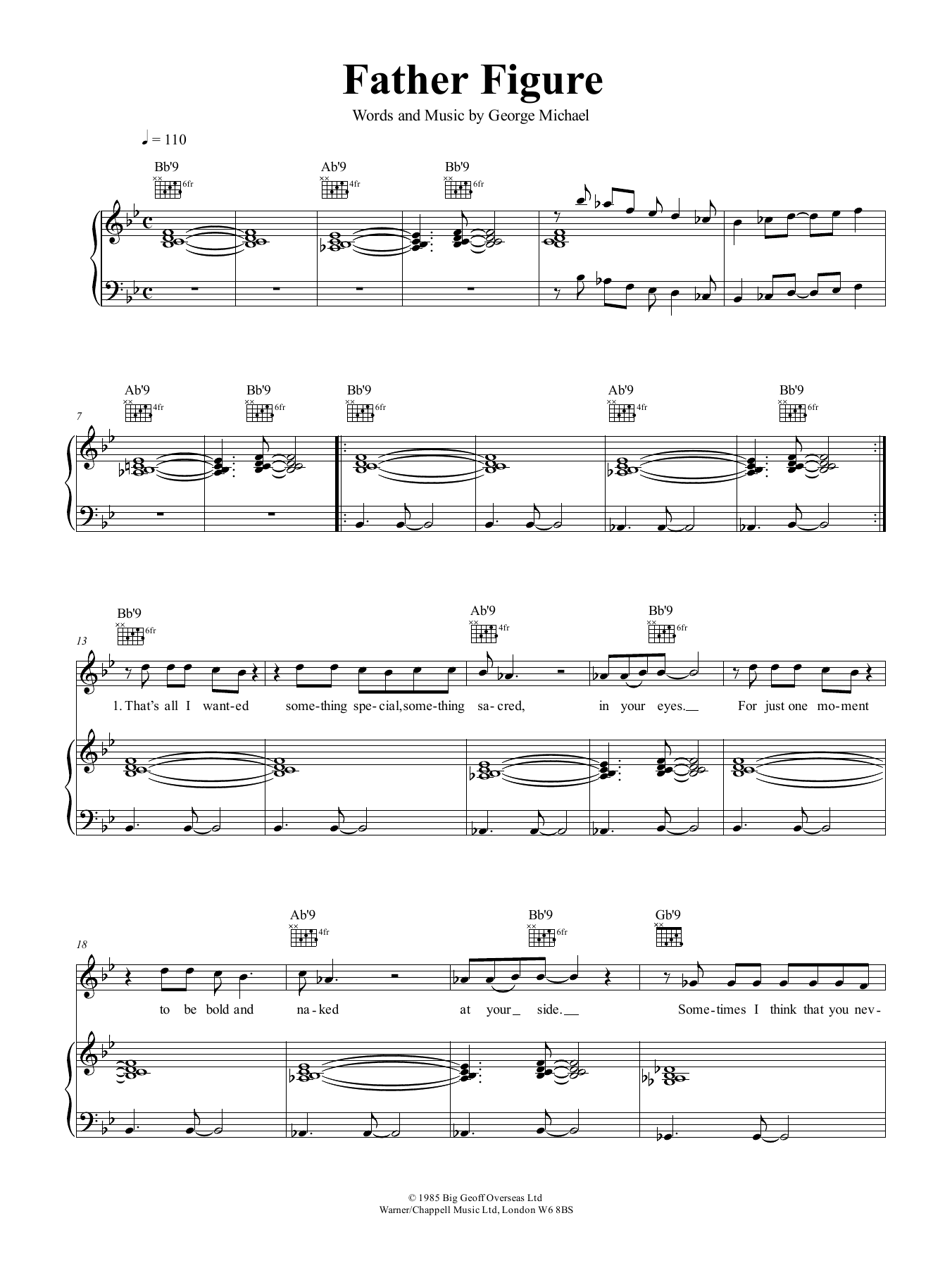 Download or print George Michael Father Figure sheet music, chords and digital score arranged for Piano, Vocal & Guitar Chords (Right-Hand Melody). This Pop score includes 8 page(s).