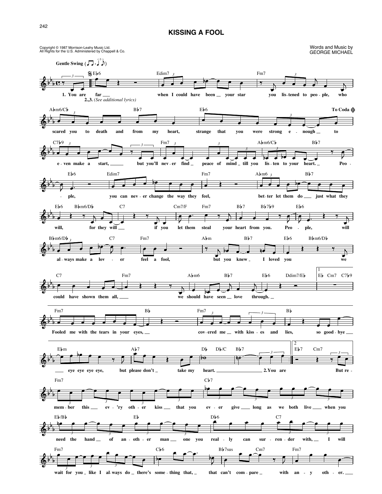 Download or print George Michael Kissing A Fool sheet music, chords and digital score arranged for Piano, Vocal & Guitar Chords (Right-Hand Melody). This Pop score includes 5 page(s).