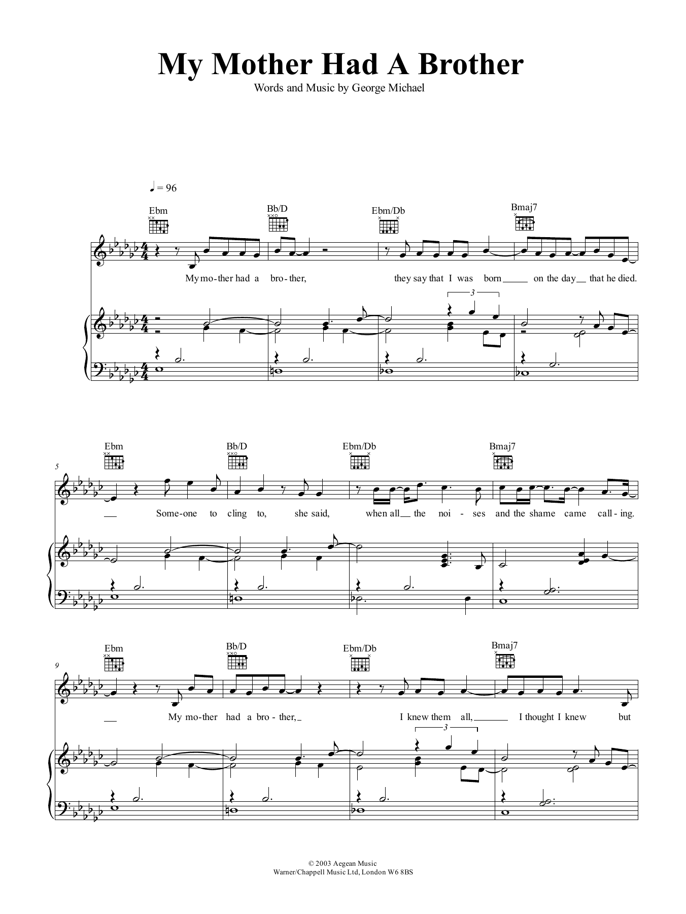 Download or print George Michael My Mother Had A Brother sheet music, chords and digital score arranged for Piano, Vocal & Guitar Chords (Right-Hand Melody). This Pop score includes 8 page(s).