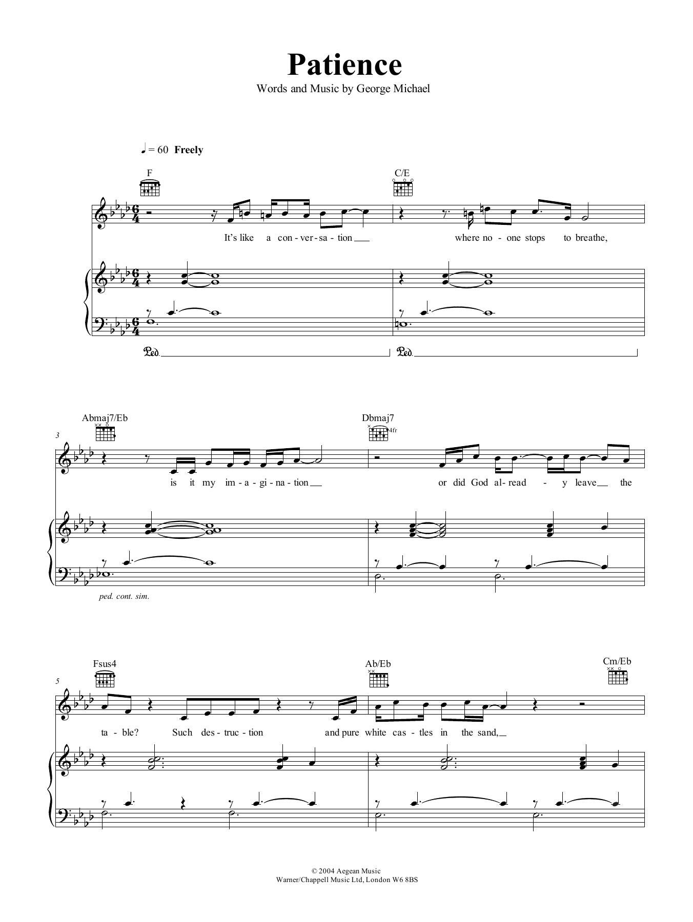 Download or print George Michael Patience sheet music, chords and digital score arranged for Piano, Vocal & Guitar Chords (Right-Hand Melody). This Pop score includes 4 page(s).