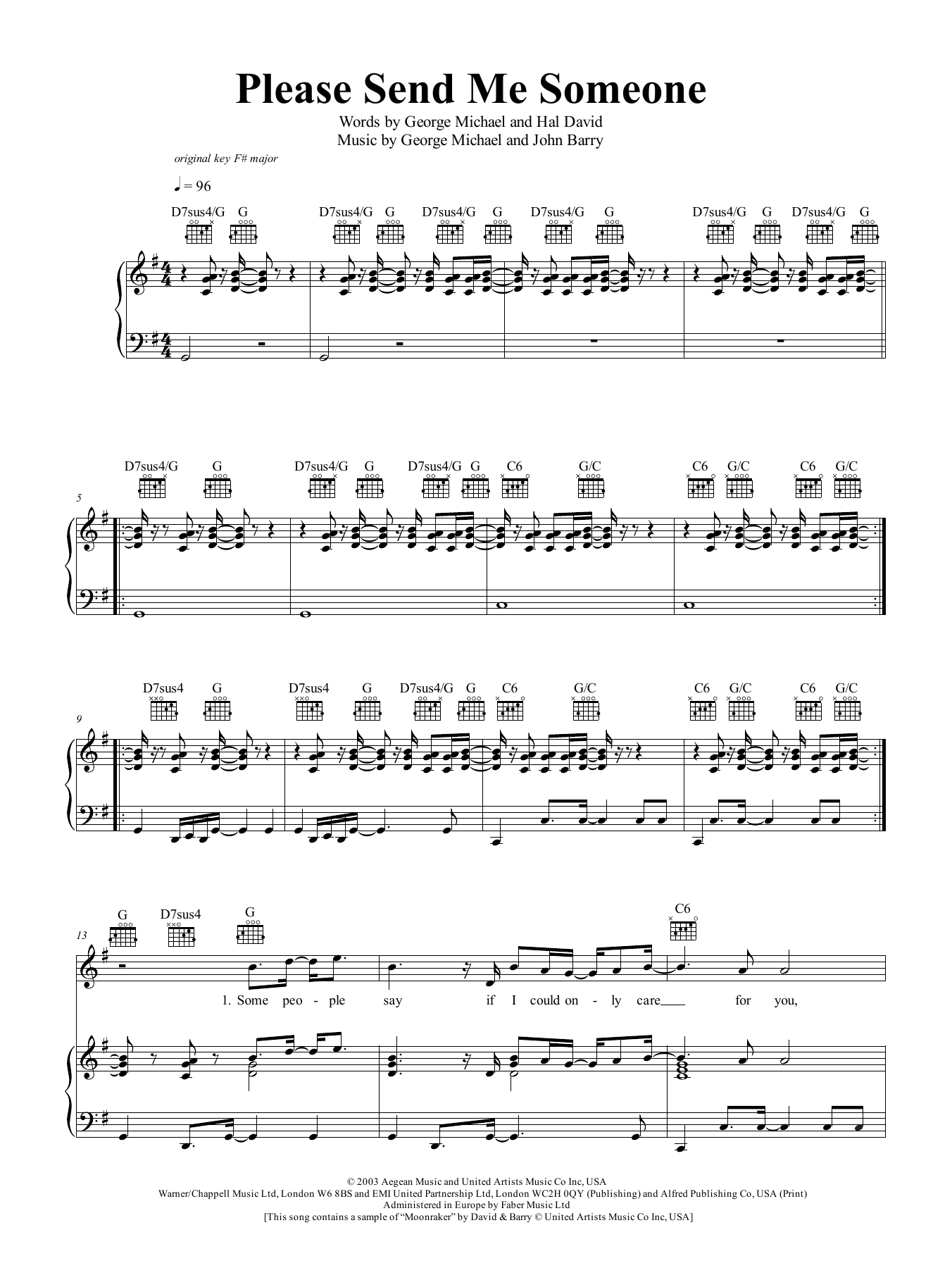 Download or print George Michael Please Send Me Someone sheet music, chords and digital score arranged for Piano, Vocal & Guitar Chords (Right-Hand Melody). This Pop score includes 10 page(s).