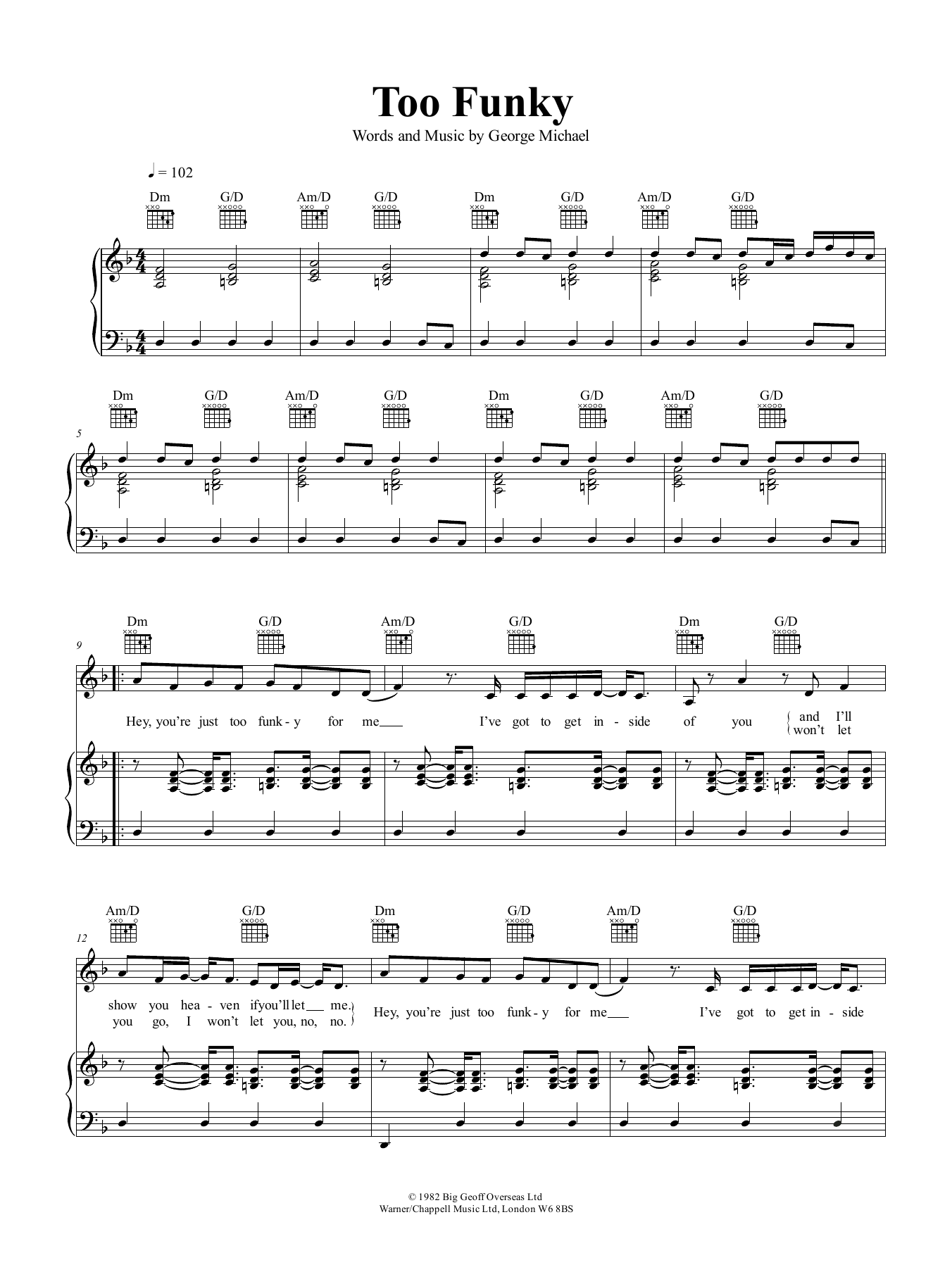 Download or print George Michael Too Funky sheet music, chords and digital score arranged for Piano, Vocal & Guitar Chords (Right-Hand Melody). This Pop score includes 7 page(s).