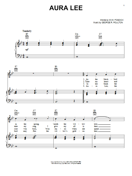 Download or print George R. Poulton Aura Lee sheet music, chords and digital score arranged for Piano, Vocal & Guitar Chords (Right-Hand Melody). This Folk score includes 2 page(s).