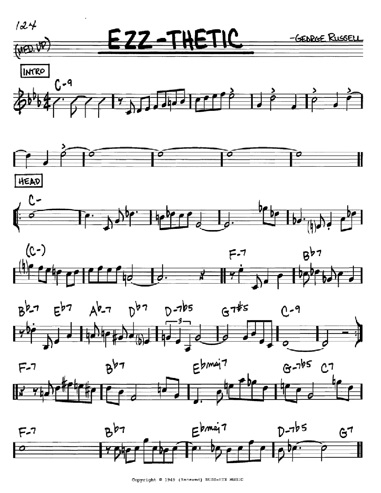 Download or print George Russell Ezz-thetic sheet music, chords and digital score arranged for Real Book – Melody & Chords – C Instruments. This Jazz score includes 2 page(s).