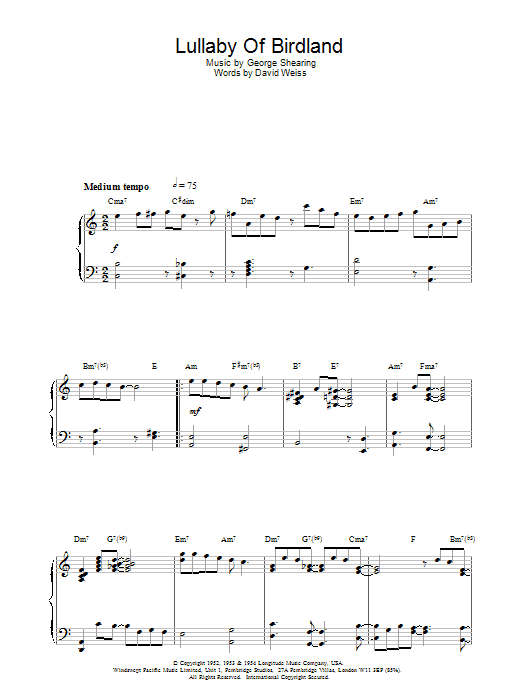 Download or print George Shearing Lullaby Of Birdland sheet music, chords and digital score arranged for Piano Solo. This Jazz score includes 2 page(s).