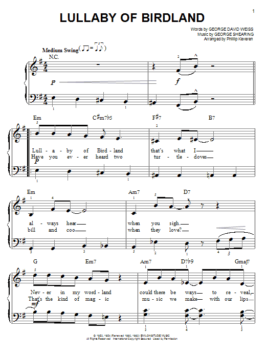 Download or print George Shearing Lullaby Of Birdland (arr. Phillip Keveren) sheet music, chords and digital score arranged for Easy Piano. This Jazz score includes 3 page(s).