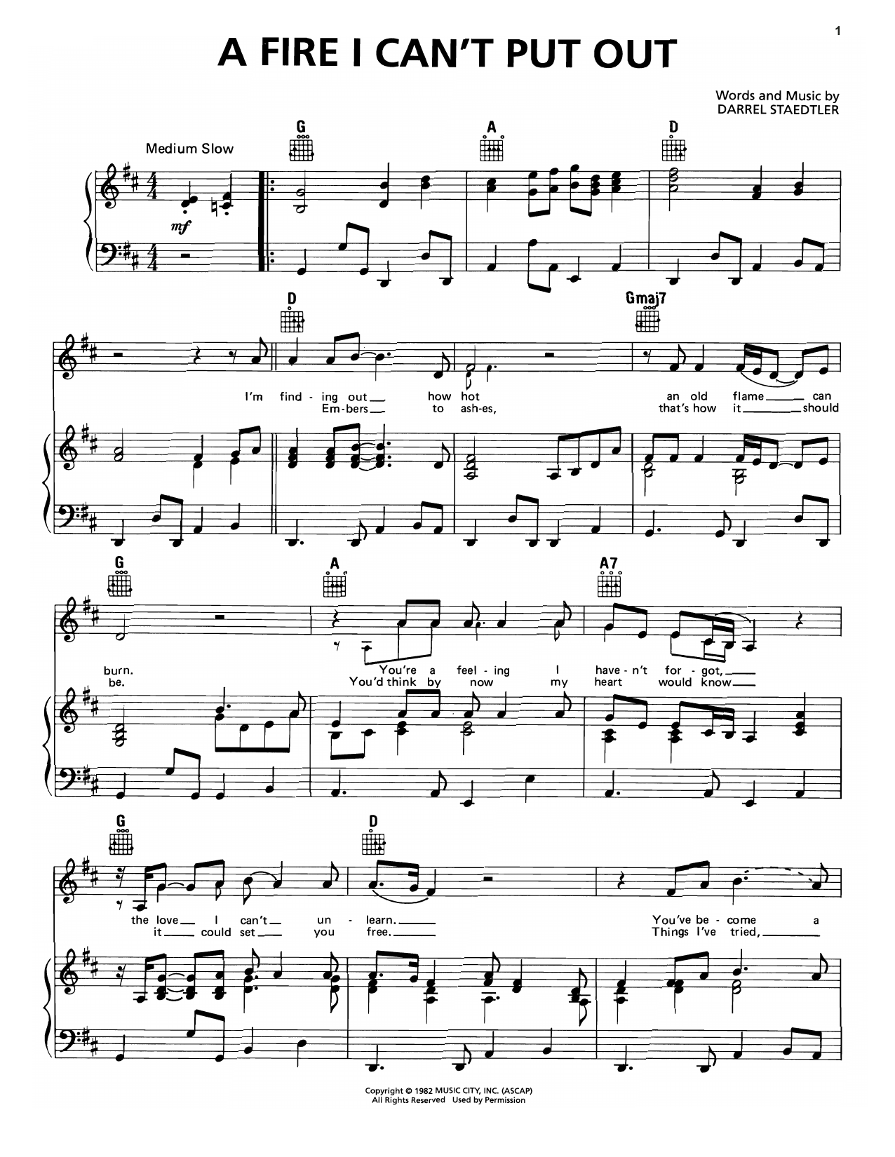 Download or print George Strait A Fire I Can't Put Out sheet music, chords and digital score arranged for Piano, Vocal & Guitar Chords (Right-Hand Melody). This Country score includes 3 page(s).