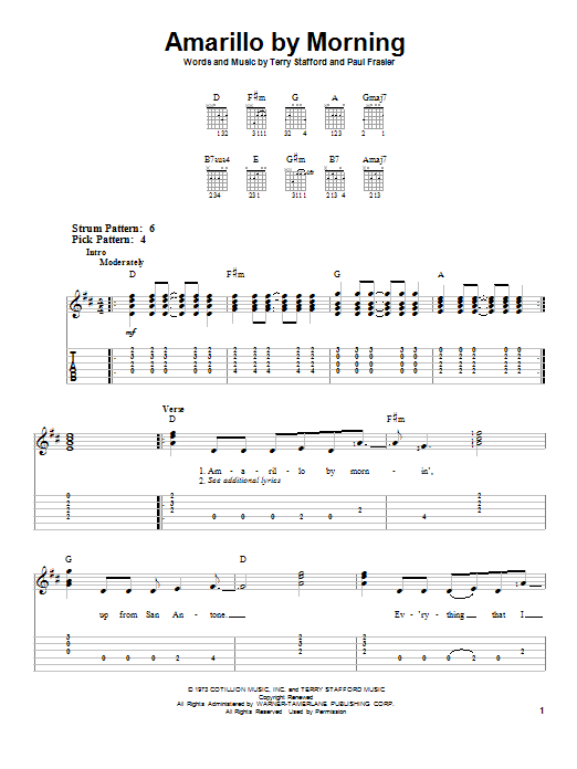 Download or print George Strait Amarillo By Morning sheet music, chords and digital score arranged for Solo Guitar. This Country score includes 2 page(s).