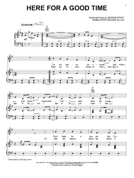 Download or print George Strait Here For A Good Time sheet music, chords and digital score arranged for Piano, Vocal & Guitar Chords (Right-Hand Melody). This Country score includes 4 page(s).