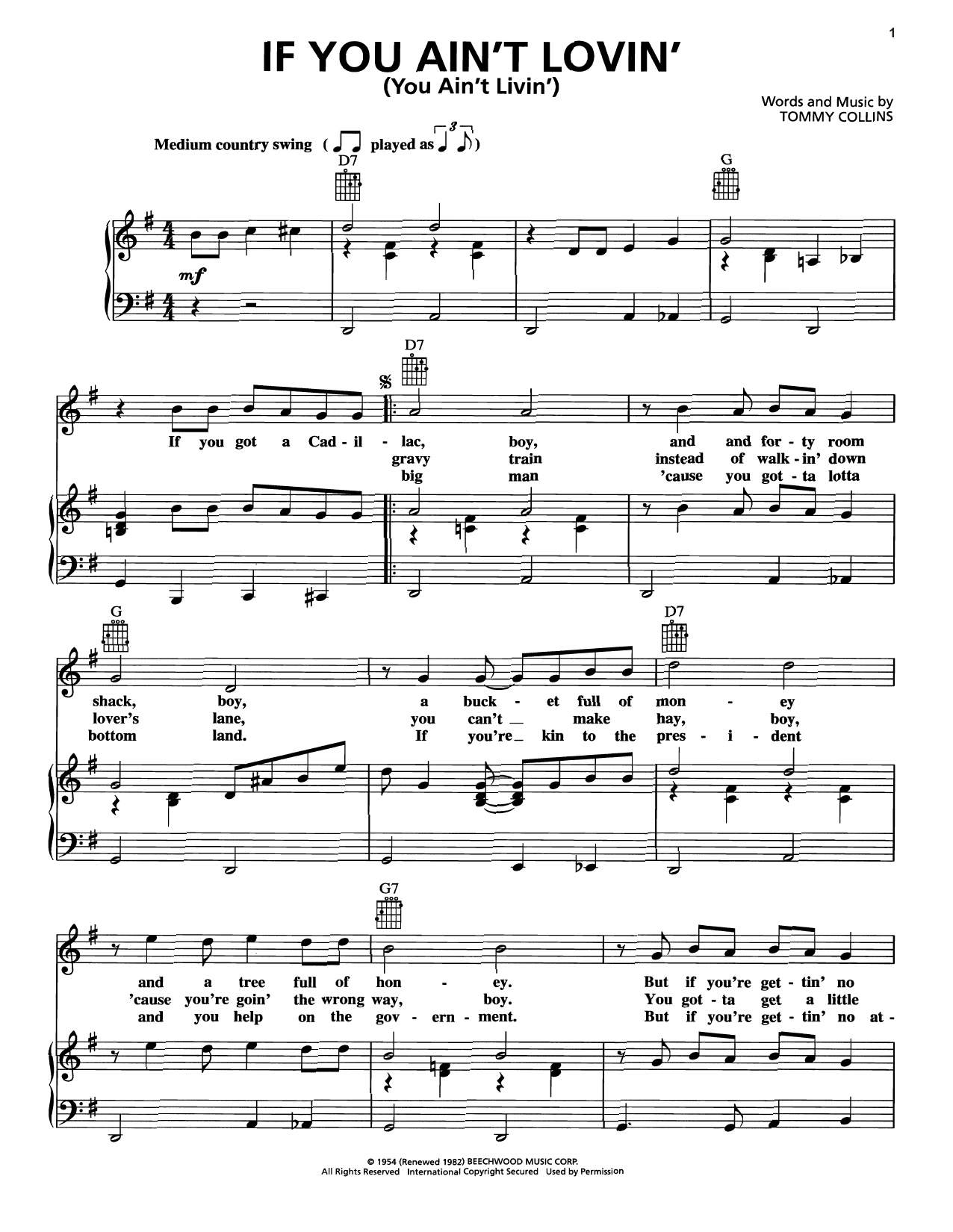 Download or print George Strait If You Ain't Lovin' (You Ain't Livin') sheet music, chords and digital score arranged for Piano, Vocal & Guitar Chords (Right-Hand Melody). This Country score includes 4 page(s).