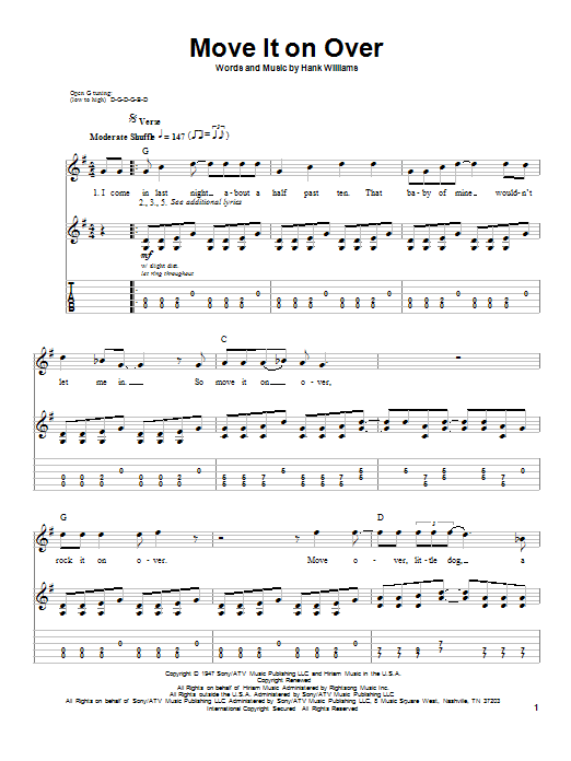Download or print George Thorogood Move It On Over sheet music, chords and digital score arranged for Guitar Tab (Single Guitar). This Blues score includes 10 page(s).
