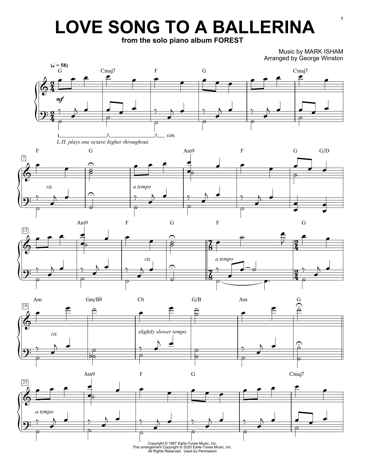 Download or print George Winston Love Song To A Ballerina sheet music, chords and digital score arranged for Easy Piano. This Contemporary score includes 3 page(s).