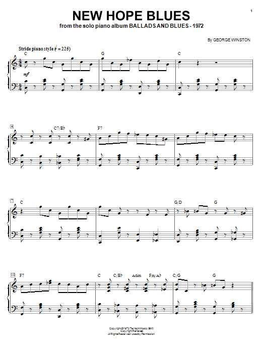 Download or print George Winston New Hope Blues sheet music, chords and digital score arranged for Piano Solo. This Pop score includes 7 page(s).