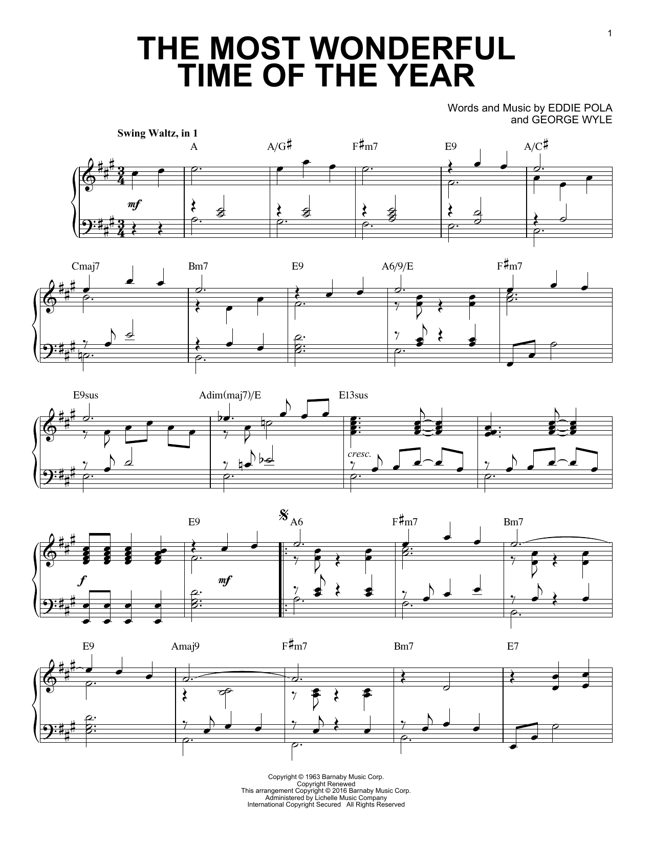 Download or print George Wyle The Most Wonderful Time Of The Year [Jazz version] (arr. Brent Edstrom) sheet music, chords and digital score arranged for Piano Solo. This Christmas score includes 5 page(s).